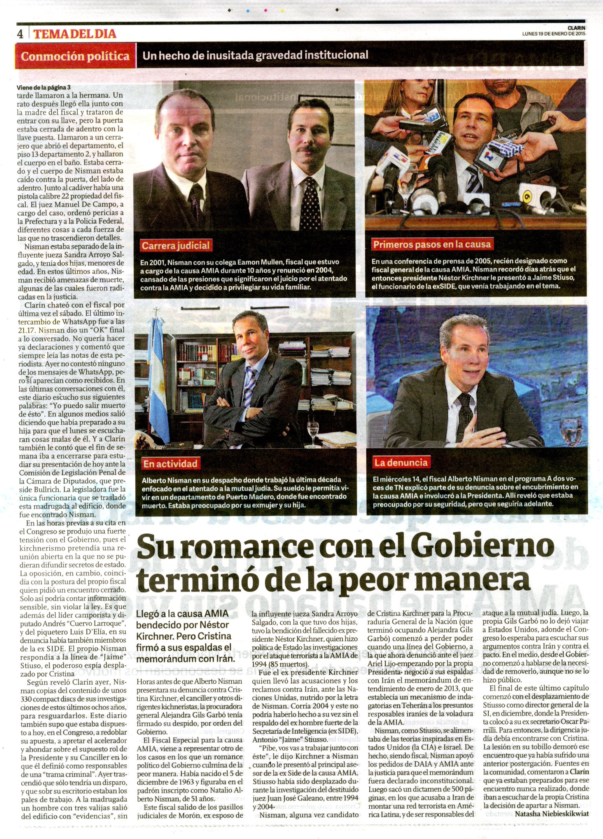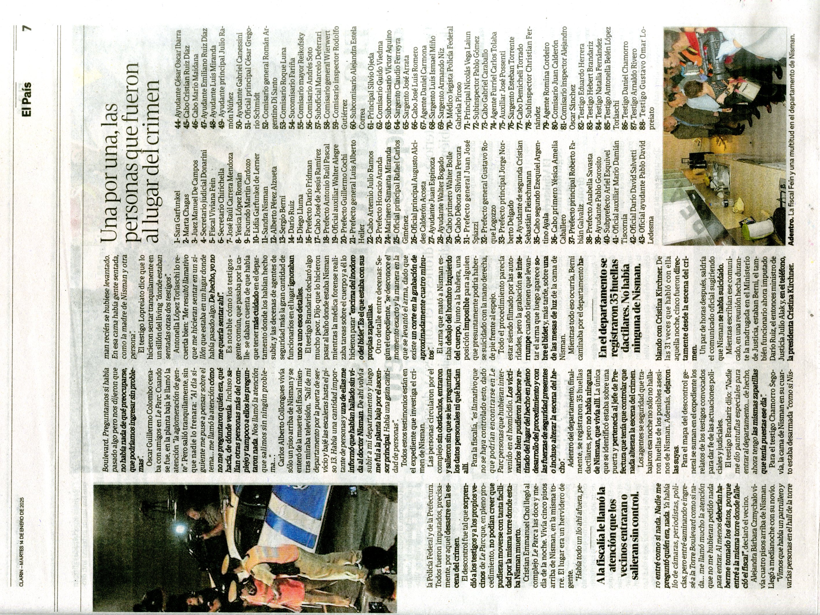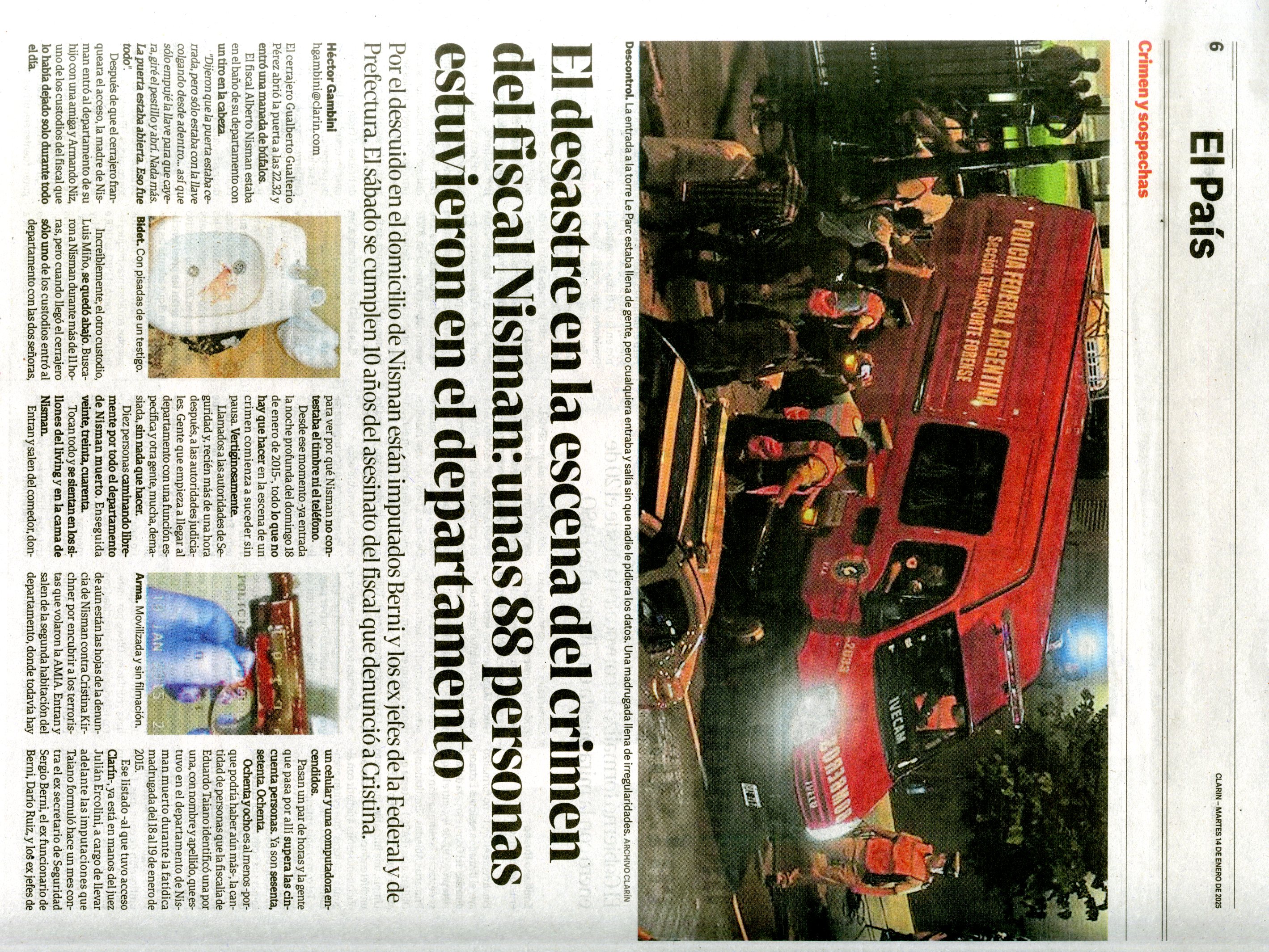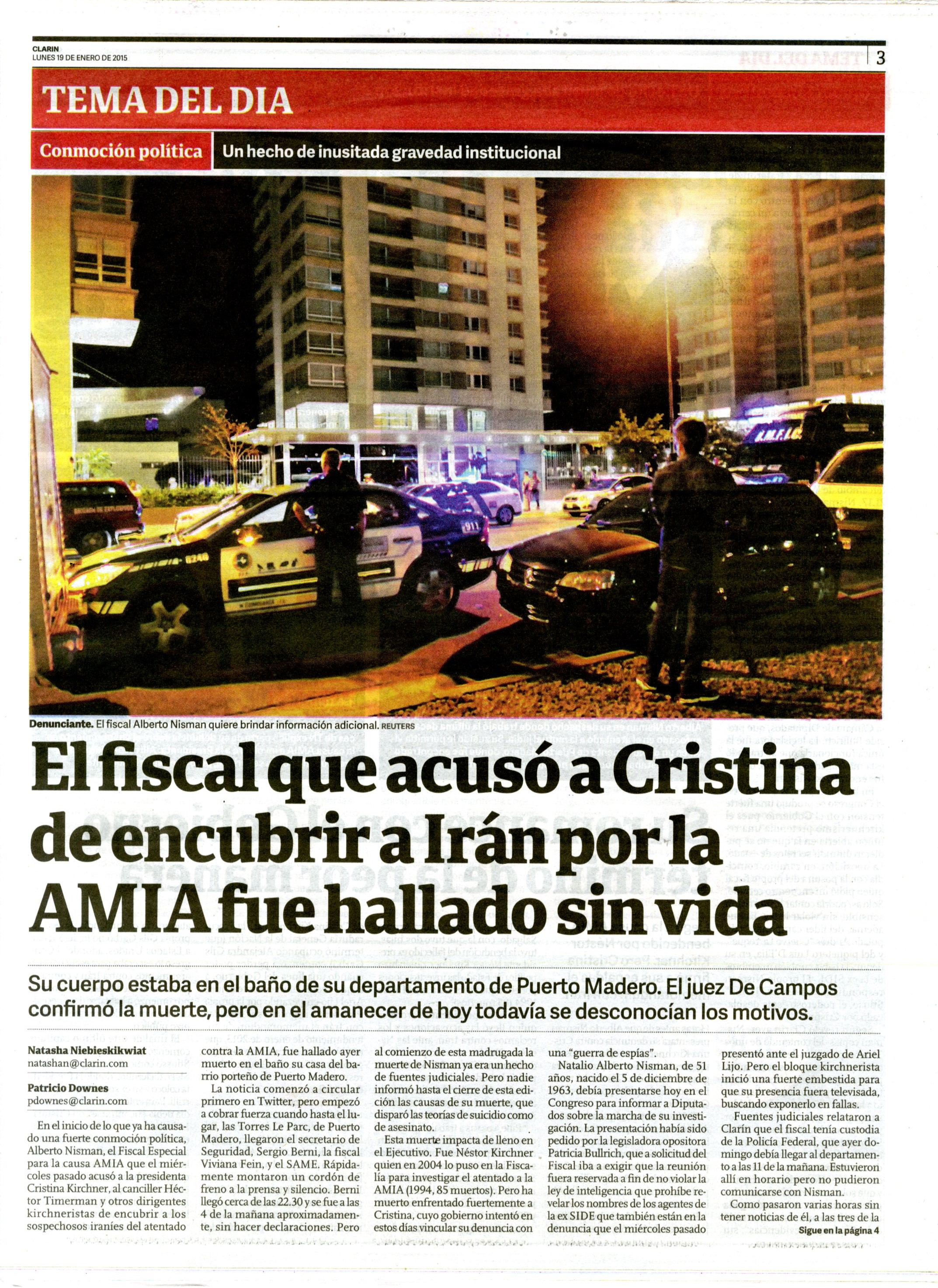 Contiene material periodístico acerca de la muerte del Fiscal Alberto Nisman, ocurrida el 18 de enero de 2015 en su departamento de Puerto Madero, horas antes de testificar ante el Congreso. Por esos momentos el fiscal intervenía en causas judiciales vinculadas al atentado a la AMIA y su conexión con Irán. Se han relevado notas de los días previos al deceso, así como las del día del hecho, las repercusiones y la larga investigación que aún continúa sin esclarecer su muerte. Material recopilado del año 2015 a la actualidad.