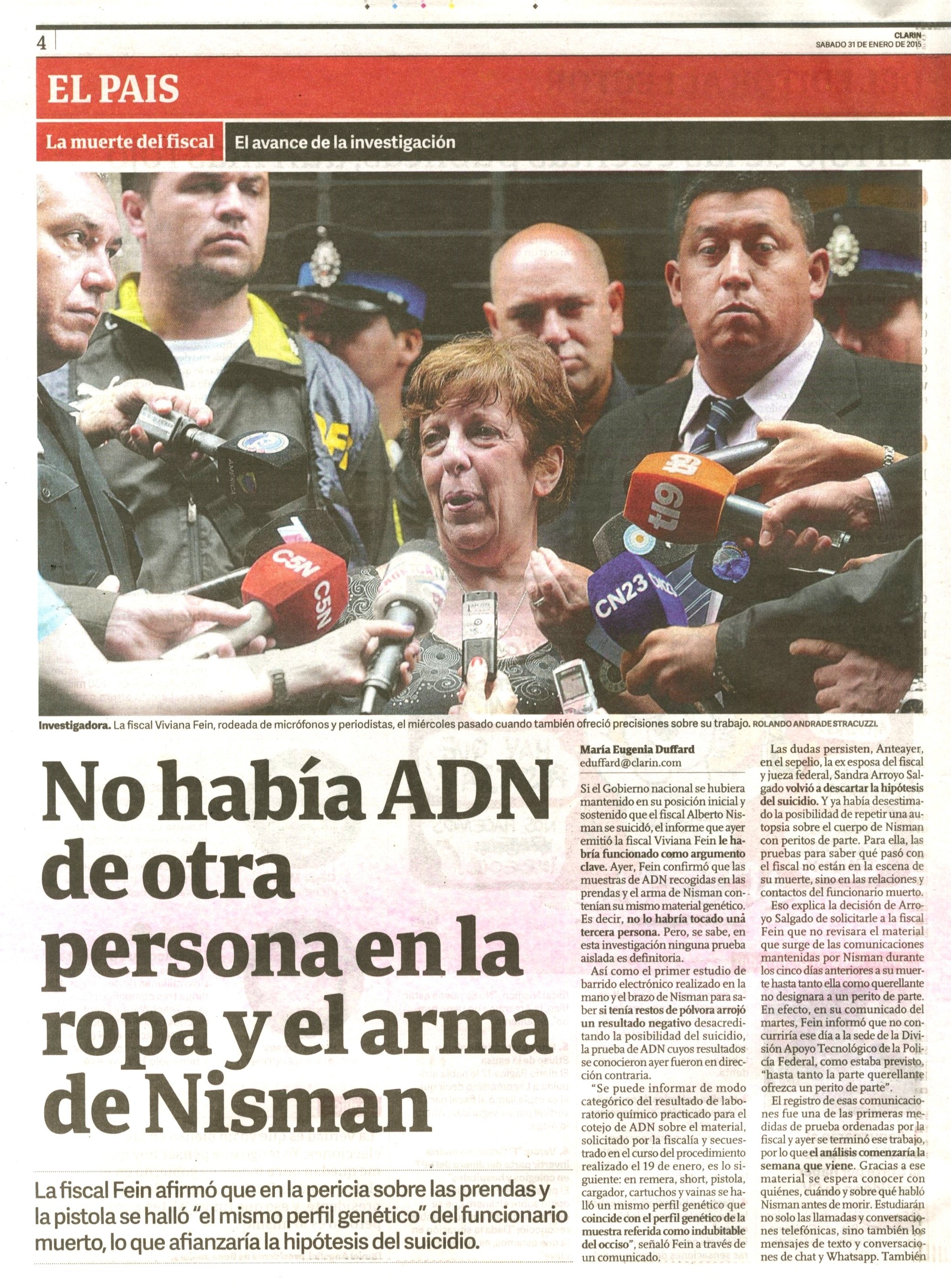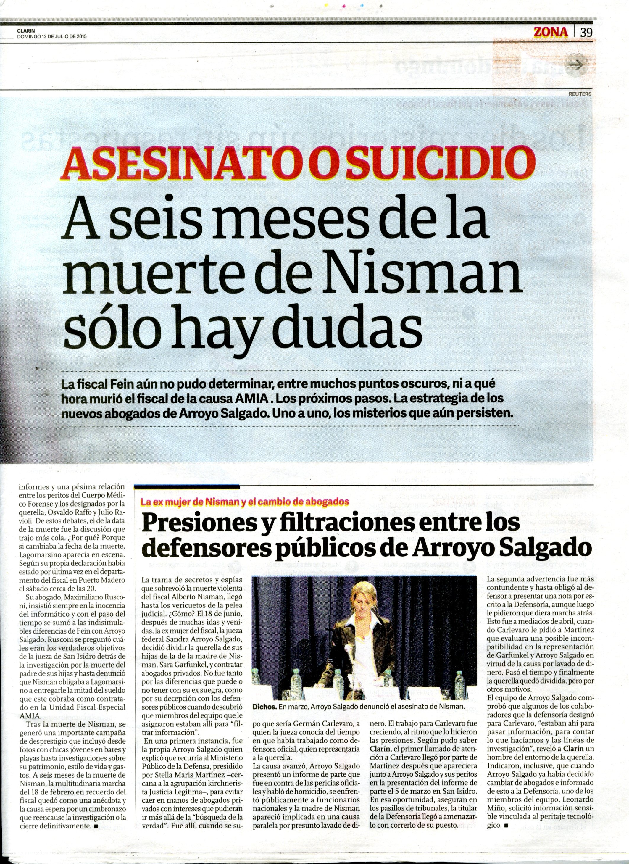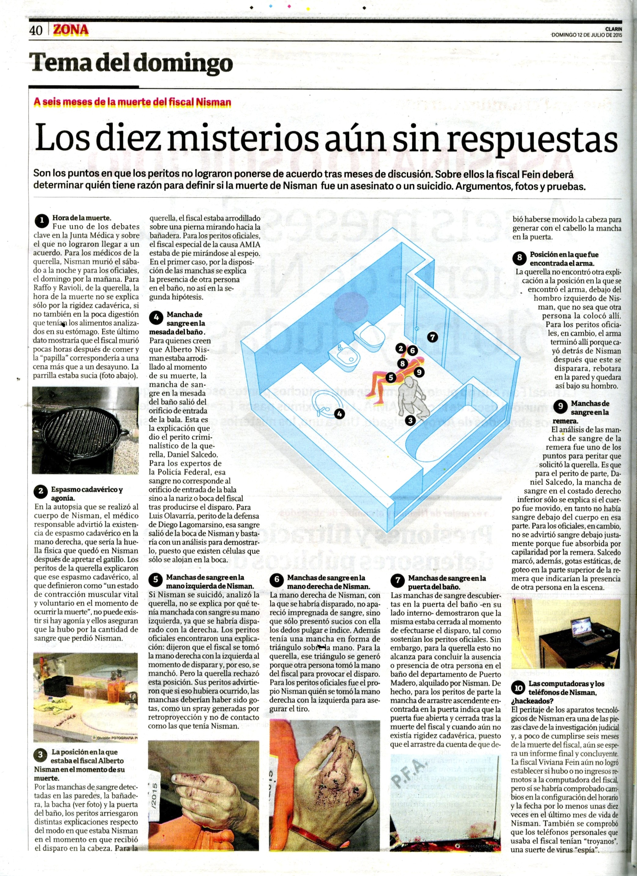 Contiene material periodístico acerca de la muerte del Fiscal Alberto Nisman, ocurrida el 18 de enero de 2015 en su departamento de Puerto Madero, horas antes de testificar ante el Congreso. Por esos momentos el fiscal intervenía en causas judiciales vinculadas al atentado a la AMIA y su conexión con Irán. Se han relevado notas de los días previos al deceso, así como las del día del hecho, las repercusiones y la larga investigación que aún continúa sin esclarecer su muerte. Material recopilado del año 2015 a la actualidad.