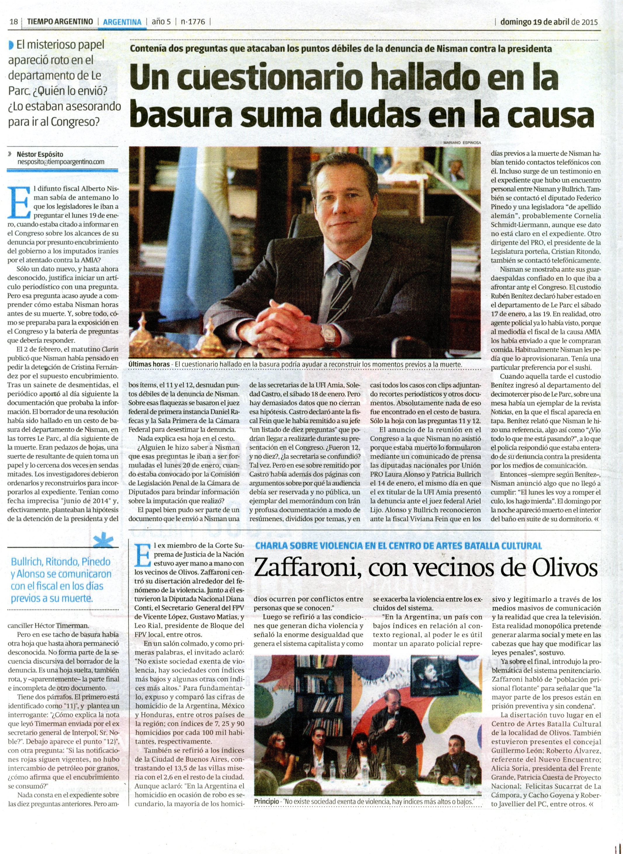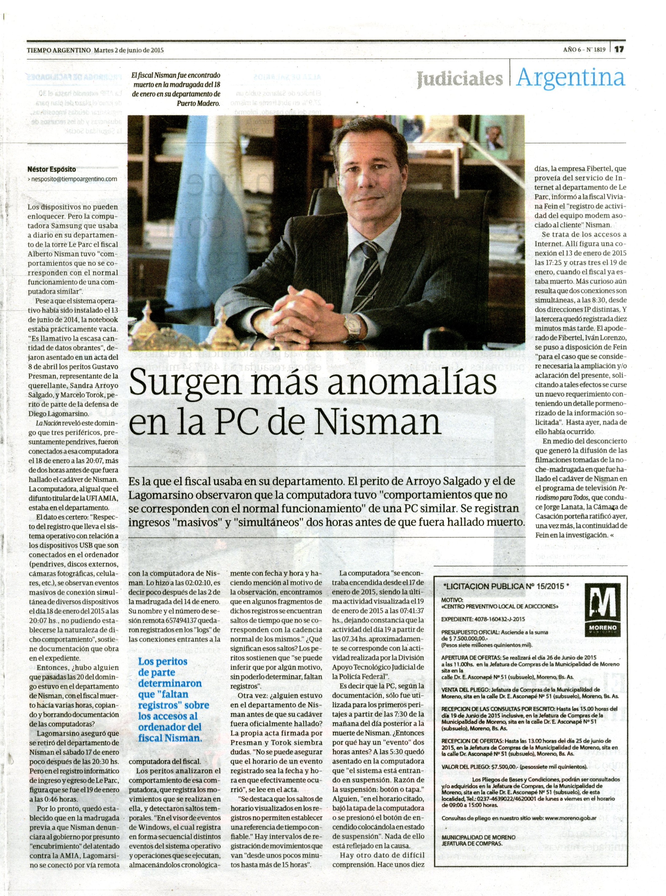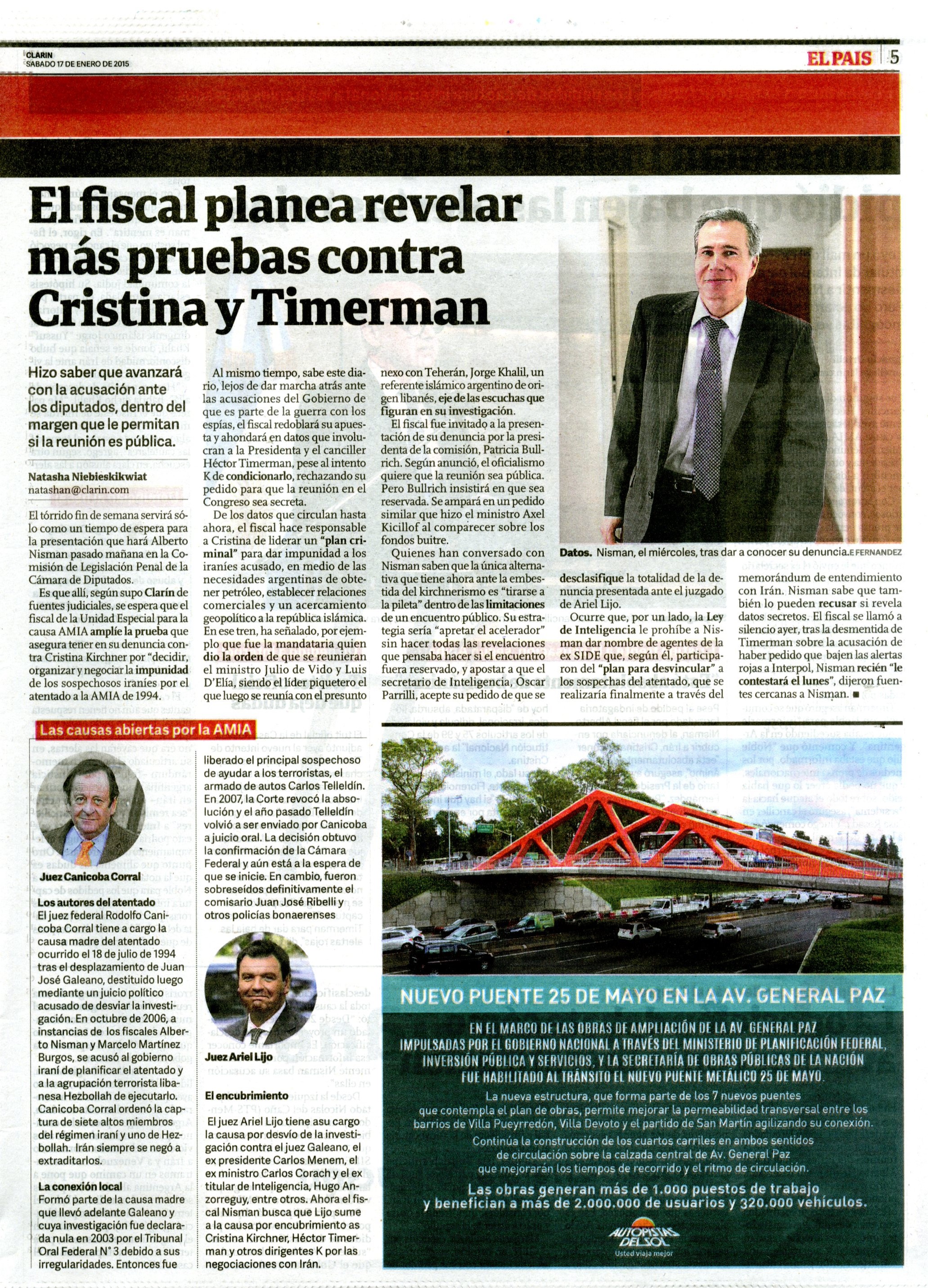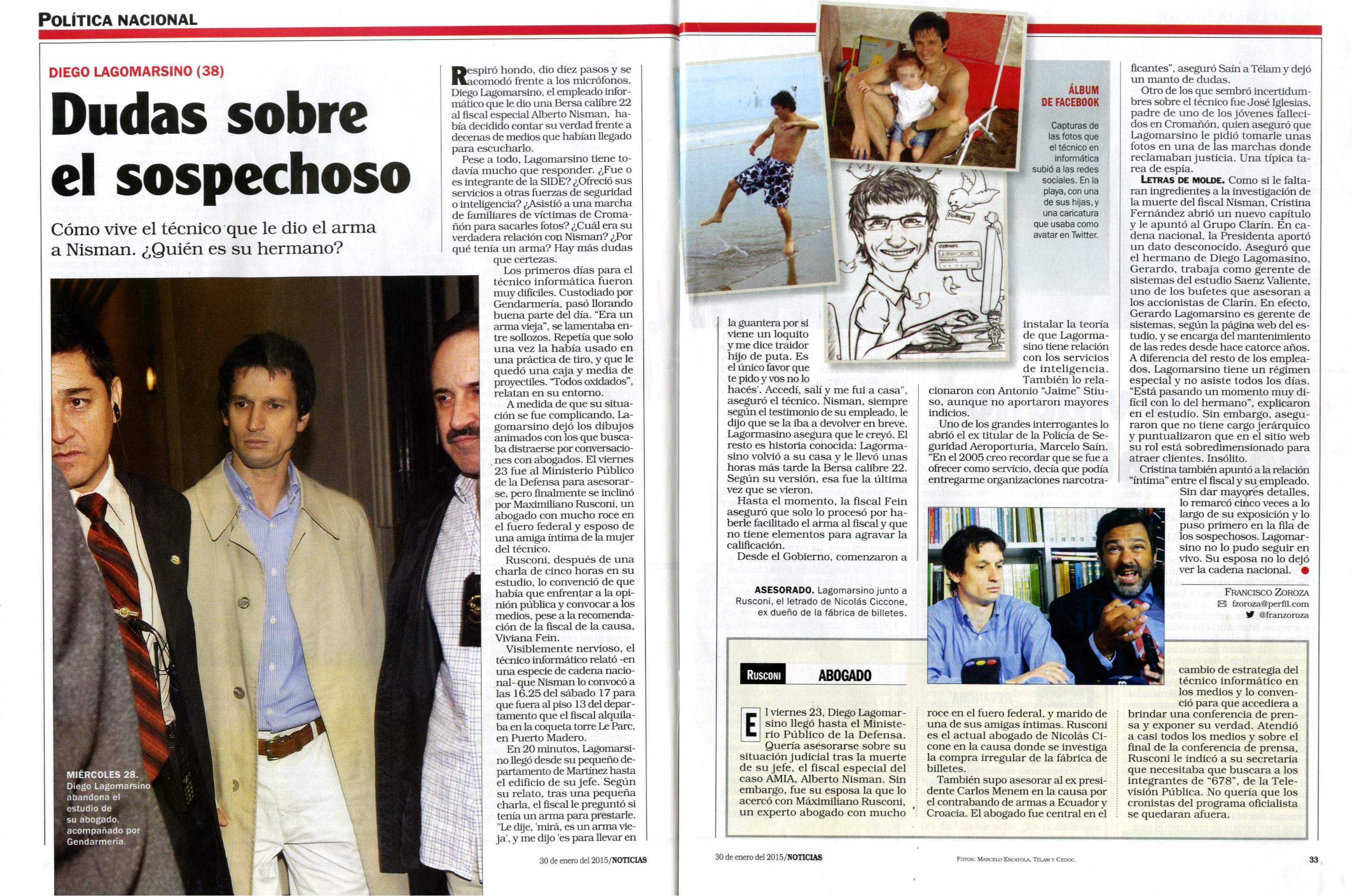 Contiene material periodístico acerca de la muerte del Fiscal Alberto Nisman, ocurrida el 18 de enero de 2015 en su departamento de Puerto Madero, horas antes de testificar ante el Congreso. Por esos momentos el fiscal intervenía en causas judiciales vinculadas al atentado a la AMIA y su conexión con Irán. Se han relevado notas de los días previos al deceso, así como las del día del hecho, las repercusiones y la larga investigación que aún continúa sin esclarecer su muerte. Material recopilado del año 2015 a la actualidad.