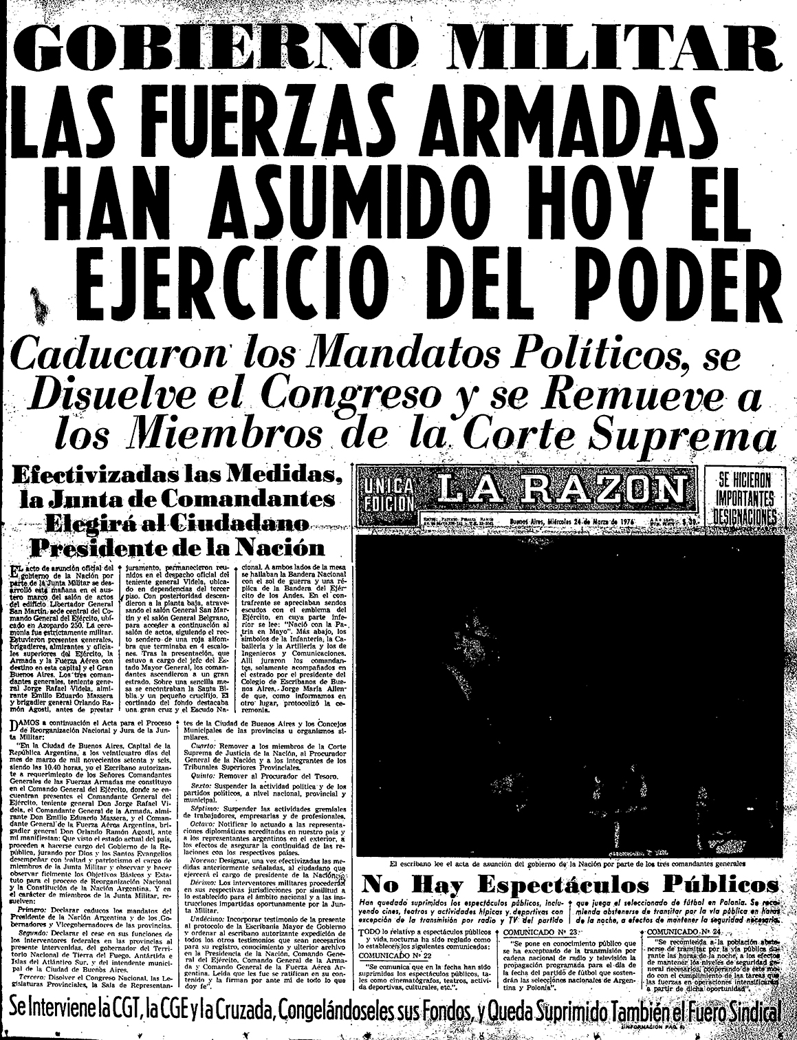 El Proceso de Reorganización Nacional fue una dictadura cívico-militar que causó que decenas de miles de personas fueran asesinadas, desaparecidas, violadas, torturadas, secuestradas siendo bebés, o debieran nacer en cautiverio, padecer la sustracción de su identidad y sufrir el exilio. Las organizaciones de derechos humanos, los sindicatos, el movimiento estudiantil, los movimientos sociales y muchos partidos políticos hacen referencia a los más de 30000 detenidos desaparecidos,[ que fueron víctimas de la última dictadura y cuya presencia en la sociedad actual se invoca en cada conmemoración al grito «30000 detenidos-desaparecidos ¡Presentes! ¡Ahora y siempre!»
