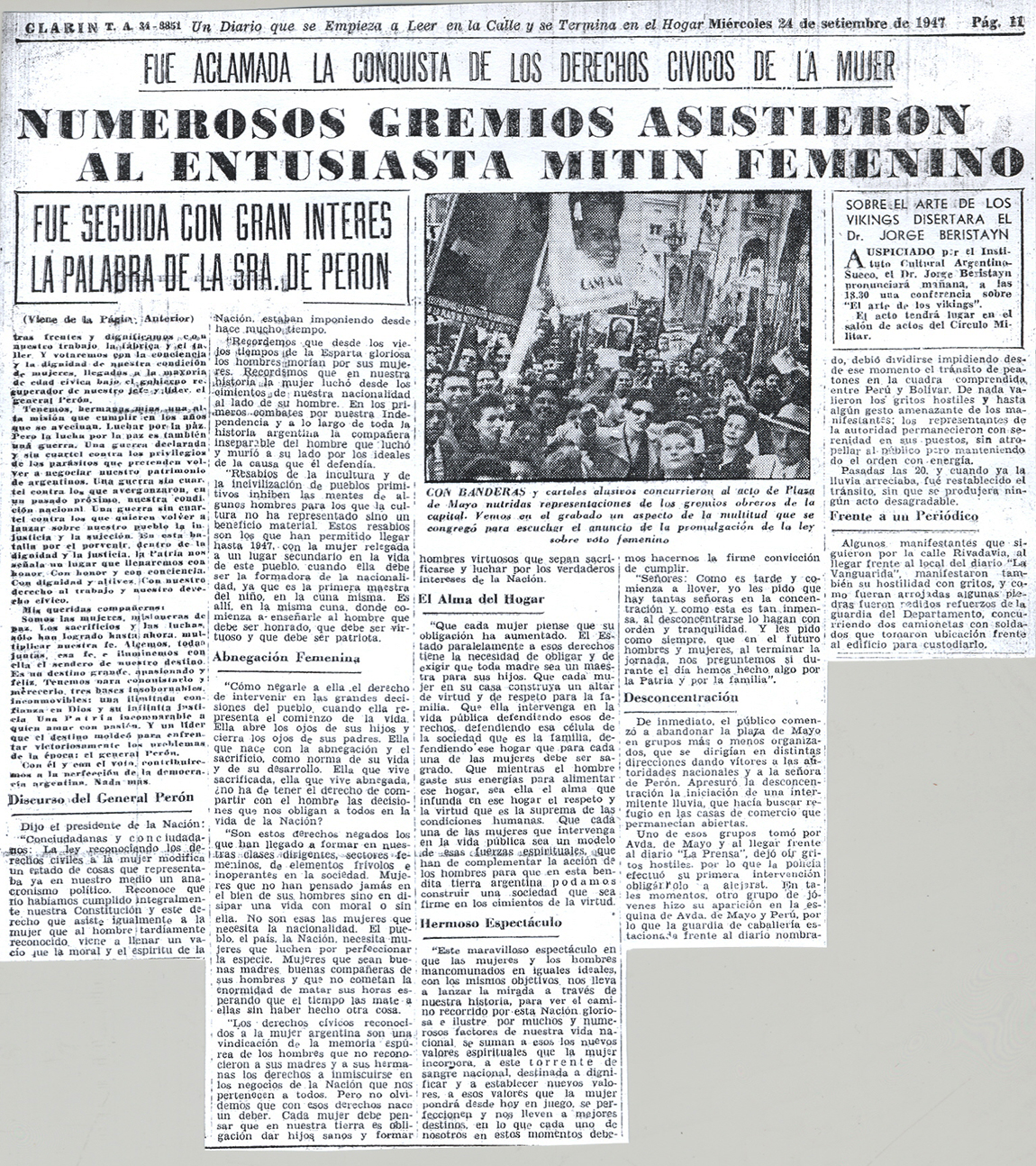 El sufragio femenino en Argentina se consiguió en 1947, con la sanción de la Ley 13.010 de sufragio femenino, también conocida como ley Evita, debido a Eva Perón