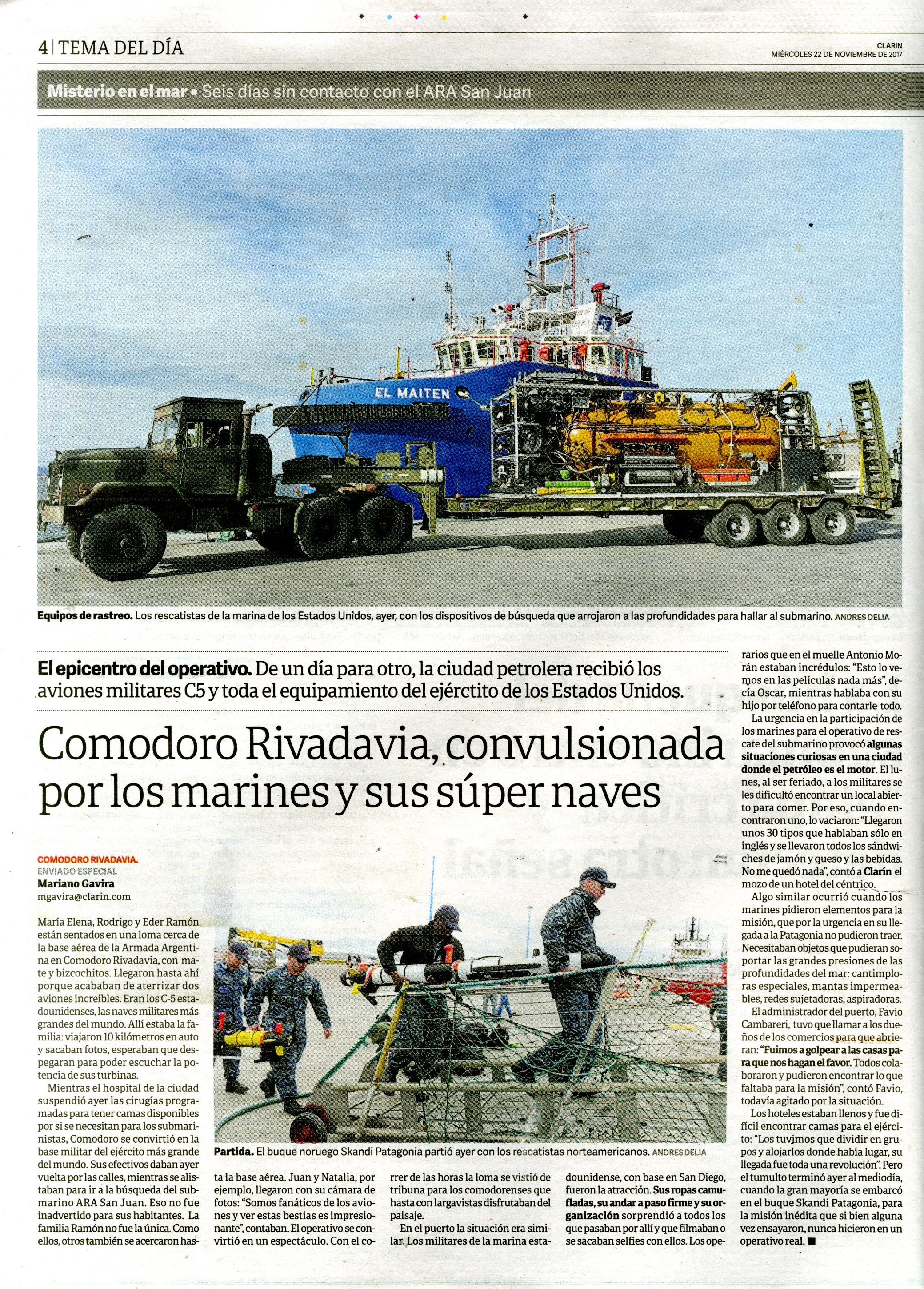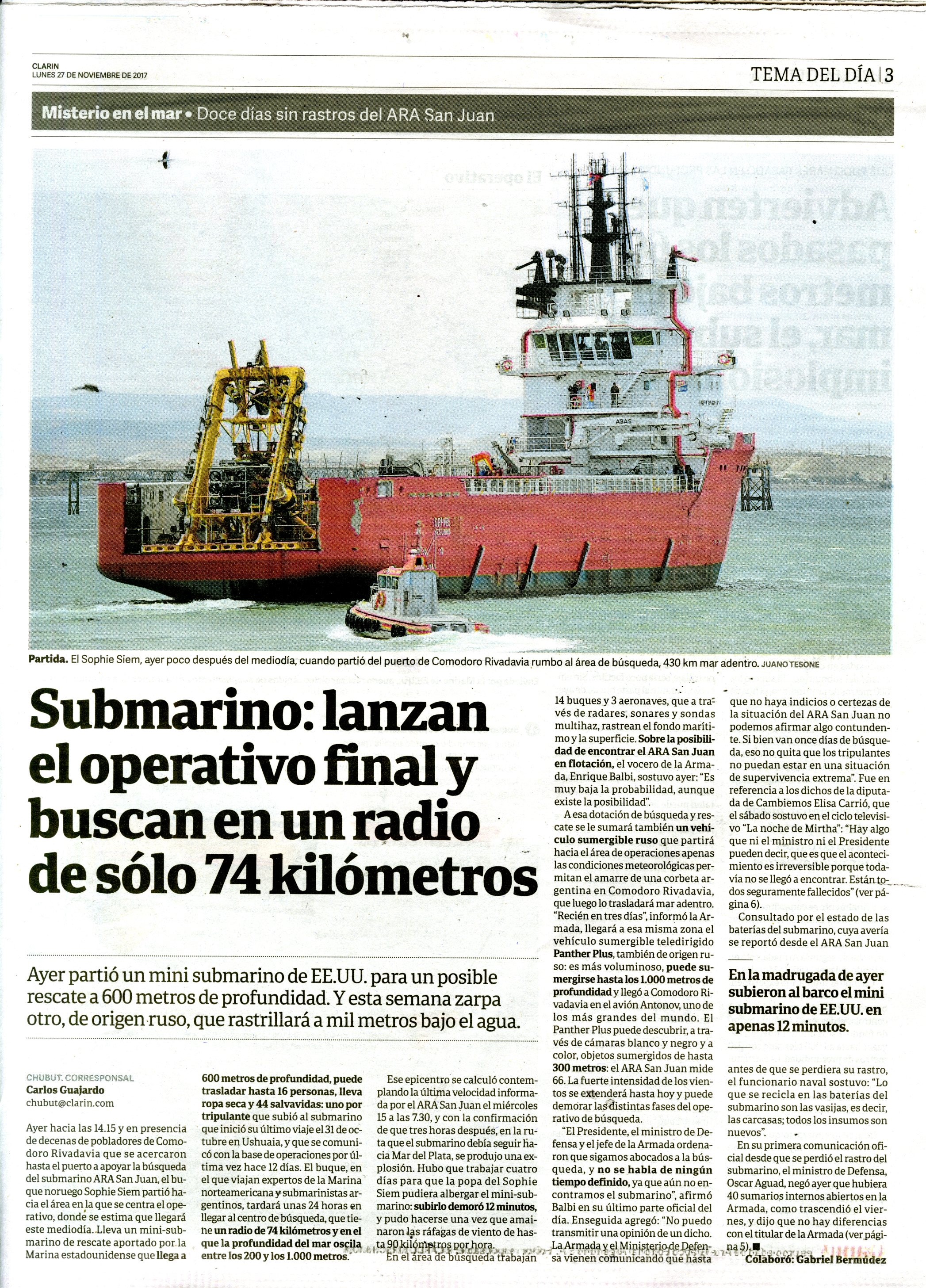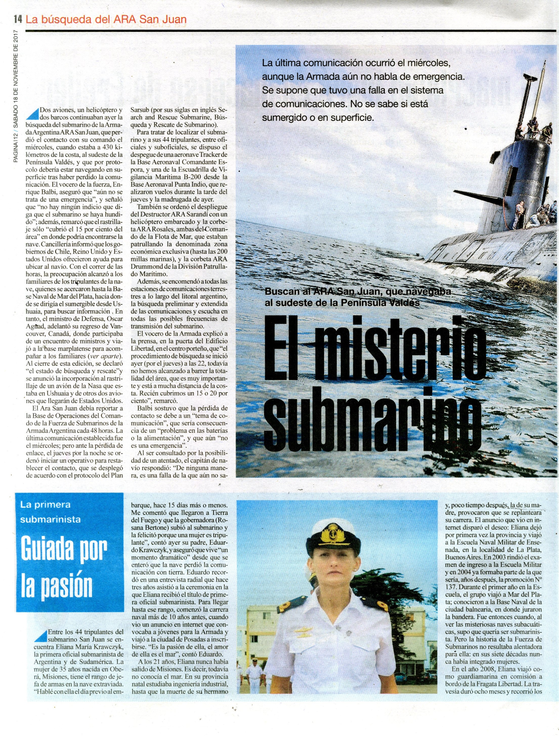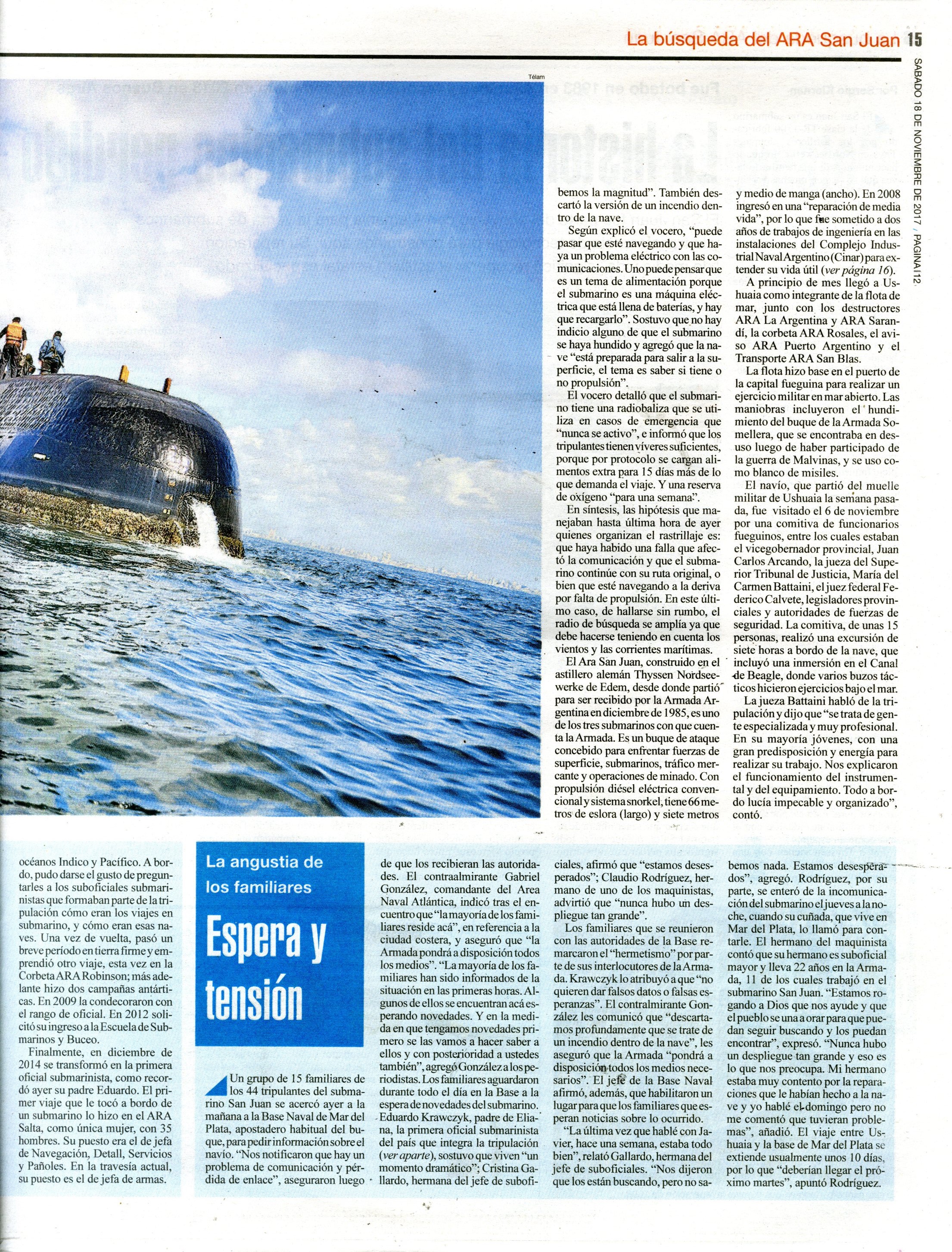 Se trató de un submarino de la Armada Argentina que desapareció el 15 de noviembre de 2017 en el Mar Argentino mientras se trasladaba de Ushuaia a Mar del Plata. Se cree que su hundimiento fue consecuencia de una implosión, llevaba 44 tripulantes a bordo. Dieciocho países colaboraron en la operación de búsqueda y rescate durante quince días, sin resultados. Un año más tarde el gobierno contrató a la empresa privada Ocean Infinity e inició una segunda búsqueda que logró el hallazgo de la nave el 17 de noviembre de 2018. La carpeta reúne material periodístico de todo lo acontecido, desde el 15 de noviembre de 2017 a la actualidad.
