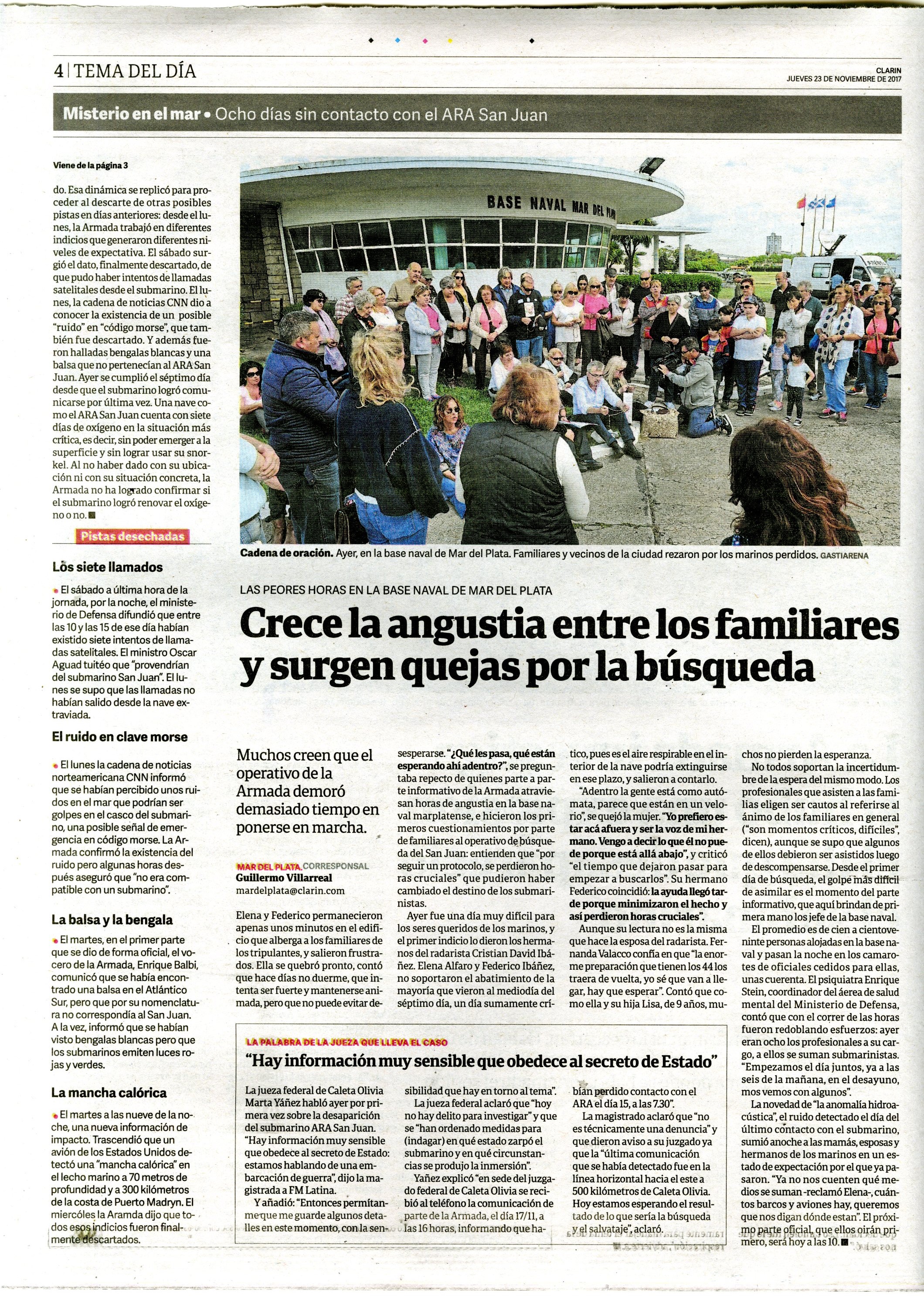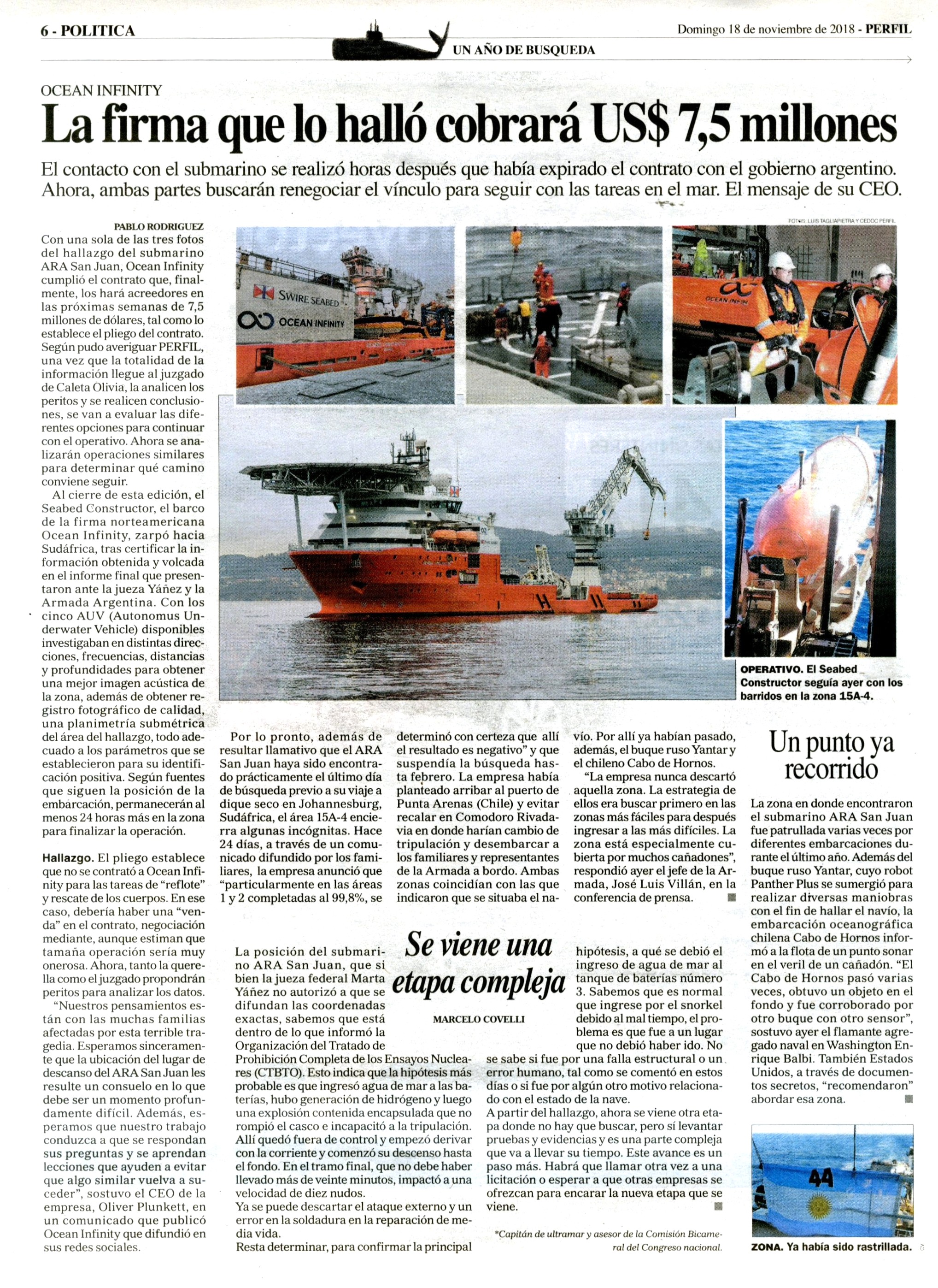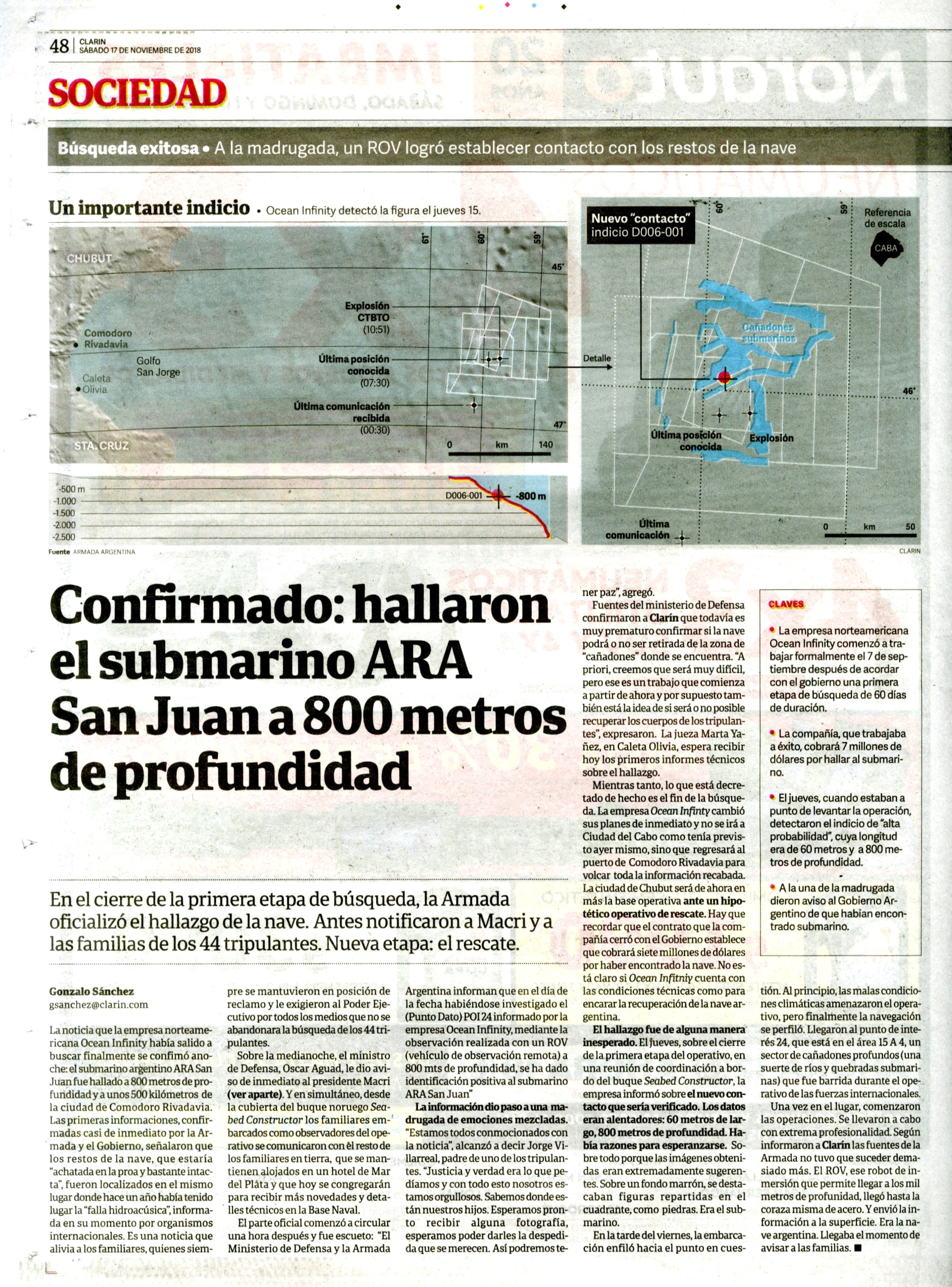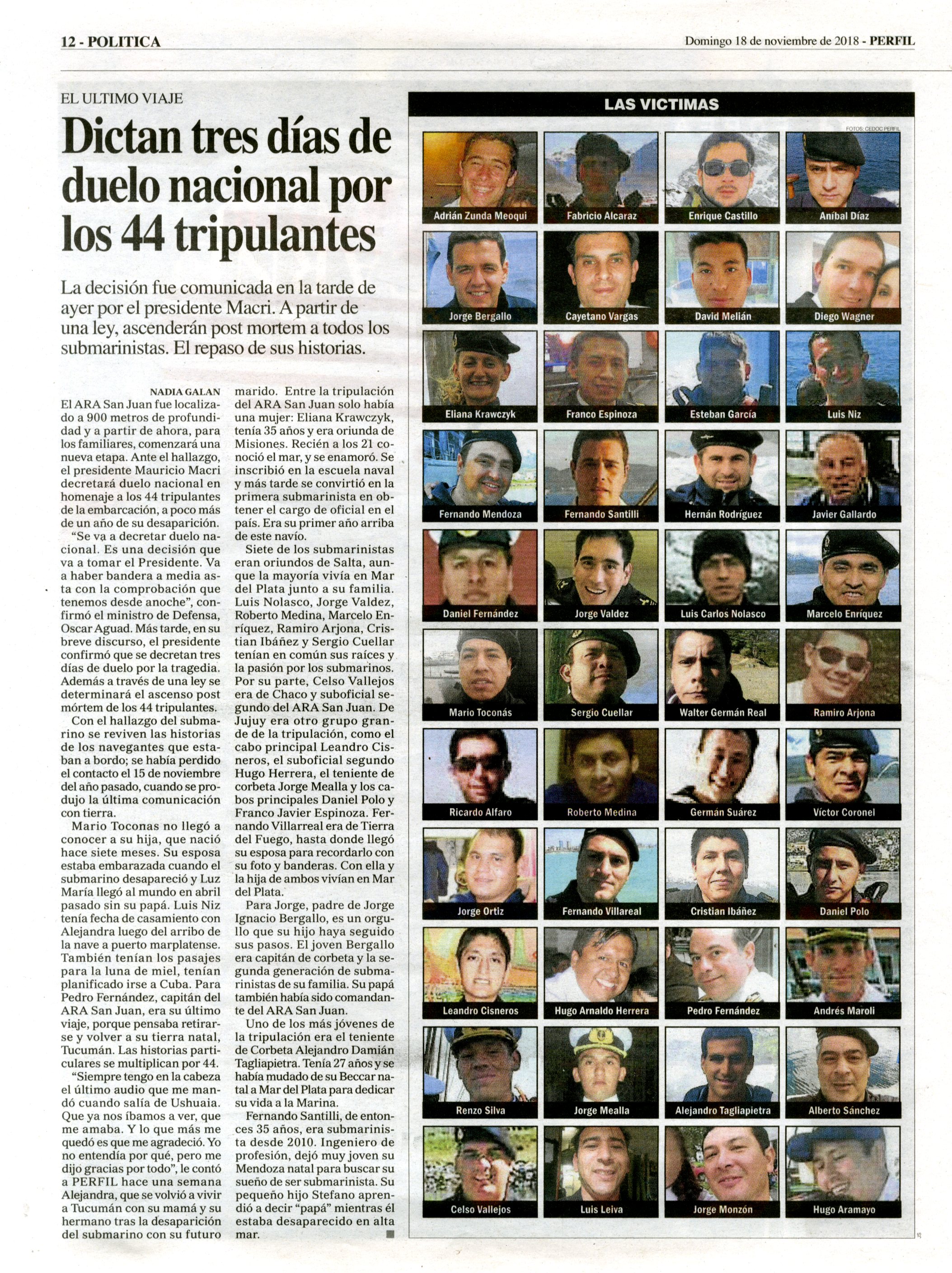 Se trató de un submarino de la Armada Argentina que desapareció el 15 de noviembre de 2017 en el Mar Argentino mientras se trasladaba de Ushuaia a Mar del Plata. Se cree que su hundimiento fue consecuencia de una implosión, llevaba 44 tripulantes a bordo. Dieciocho países colaboraron en la operación de búsqueda y rescate durante quince días, sin resultados. Un año más tarde el gobierno contrató a la empresa privada Ocean Infinity e inició una segunda búsqueda que logró el hallazgo de la nave el 17 de noviembre de 2018. La carpeta reúne material periodístico de todo lo acontecido, desde el 15 de noviembre de 2017 a la actualidad.